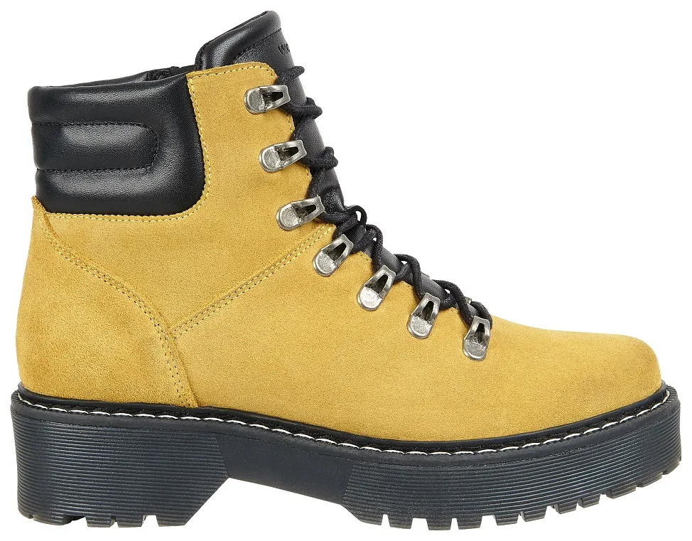 Ботинки выполнены из натуральной кожи, некоторые модели могут комбинироваться с нубуком для обеспечения удобства в носке, модели оснащены прочной нескользящей подошвой. Дизайн обуви Wojas можно назвать лаконичным, в выборе цвета бренд тяготеет к традиционным темным оттенкам черный, коричневый, но можно встретить и яркие комбинации цветов, как например, на представленной модели - контрастное сочетание желтого и черного. Дополнением к простому и лаконичному дизайну становятся контрастные строчки и металлические проушины, оригинальная шнуровка.