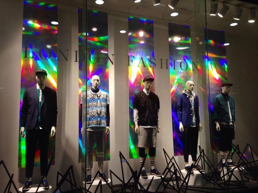 На мой взгляд, один из самых выигрышных стилей этой зимы. Здесь мы показываем будущее, используя такие материалы, как голографию, неон, различные световые элементы, зеркальный пластик и другие различные светоотражающие материалы. Сегодня их очень много, выбор огромный. Очень много возможностей в отношении деталей и декора витрины – это абстракция, футуризм., который отражается и проявляется в геометрии.