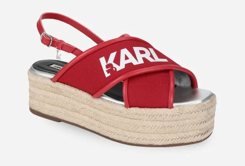 Актуальной становится пляжная обувь, которая пользуются особым успехом в таких жарких странах, как например, Аргентина. Интерпретация летней обуви в аргентинском стиле присутствует в коллекции бренда Karl Lagerfeld. В этой модели модно все – от высокой резиновой подошвы-платформы (5 см), отделанной джутом, до толстых в спортивном стиле эластичных ремней верха с крупным брендингом Karl. Цена сандалий - 14 668 руб.