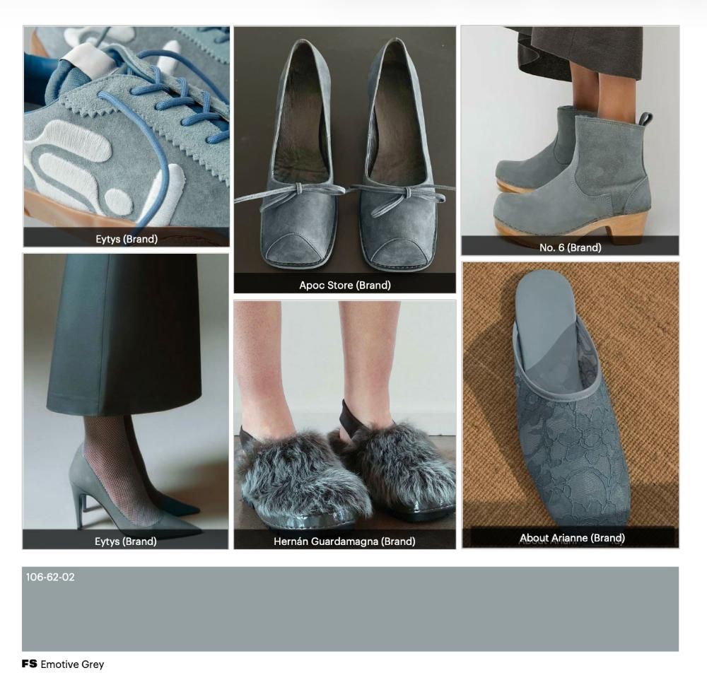 В обуви этот цвет особенно выразителен на бархате, сатине и мягкой коже. Он идеально ложится на лоферы, ботинки и кроссовки, создавая ощущение функциональности и надежности без лишней тяжести. Особенно удачно оттенок сочетается с таким же актуальным в одежде серым - вместе они дают современный, собранный образ, где уют не спорит со стилем.