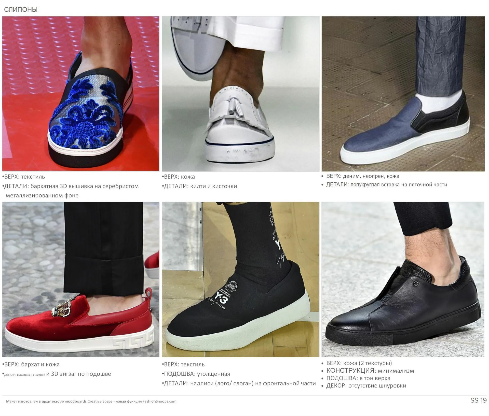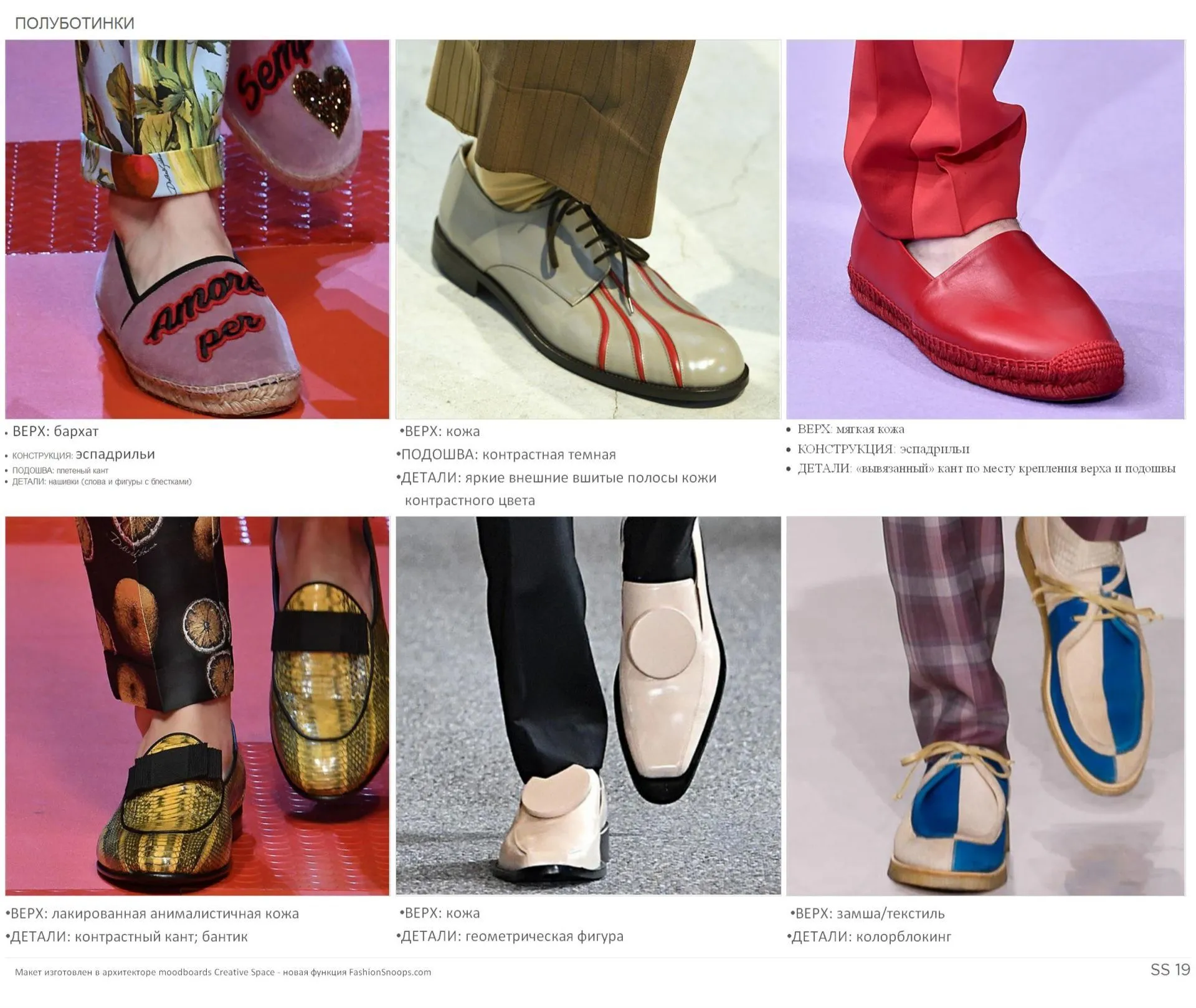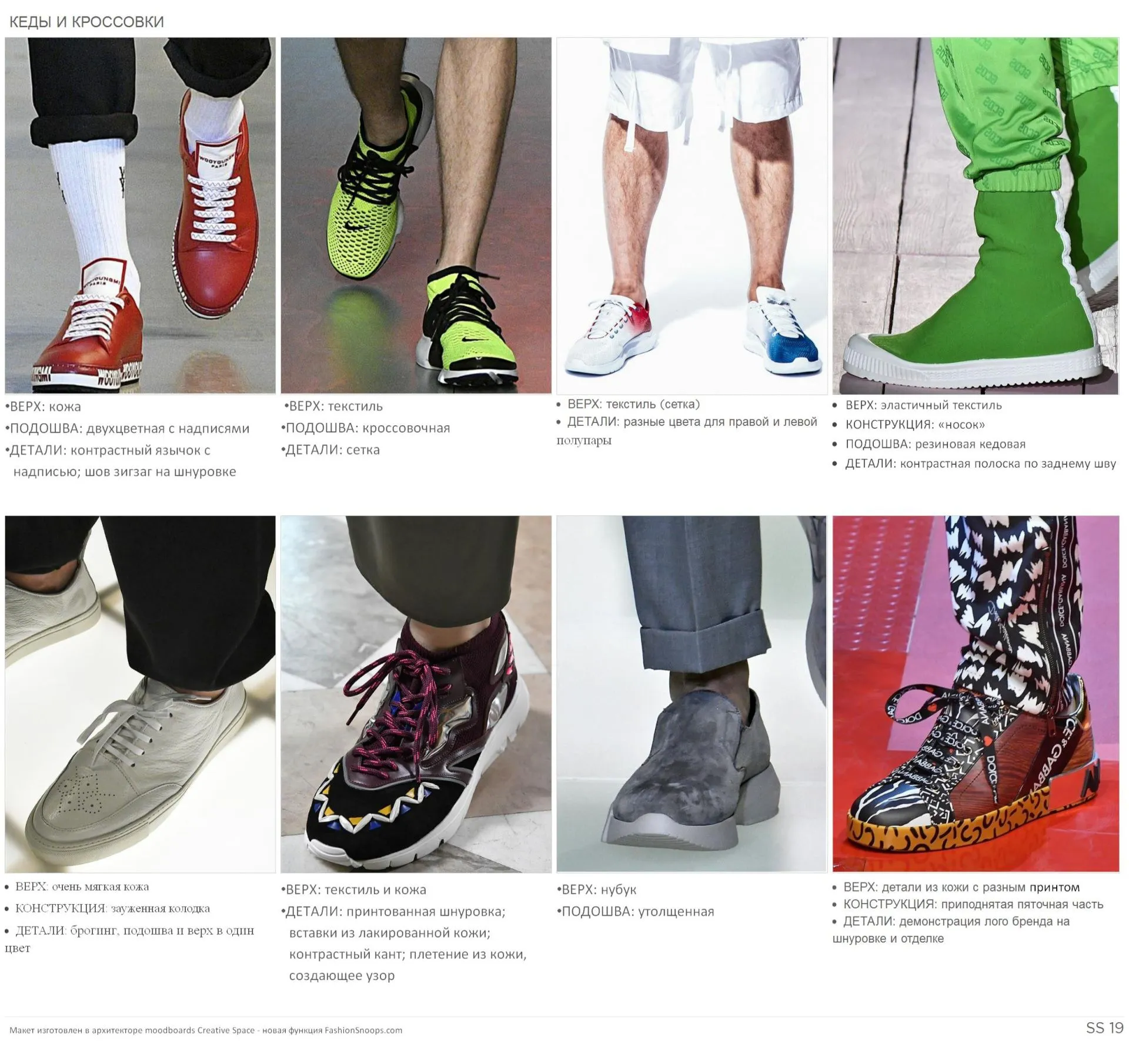 Кеды и кроссовки сезона SS19 обновлены большим количеством принтов, сочетаниями разных кож в одной модели, разнообразными материалами (нубук, неопрен, спортивная сетка), а также классическим брогингом.