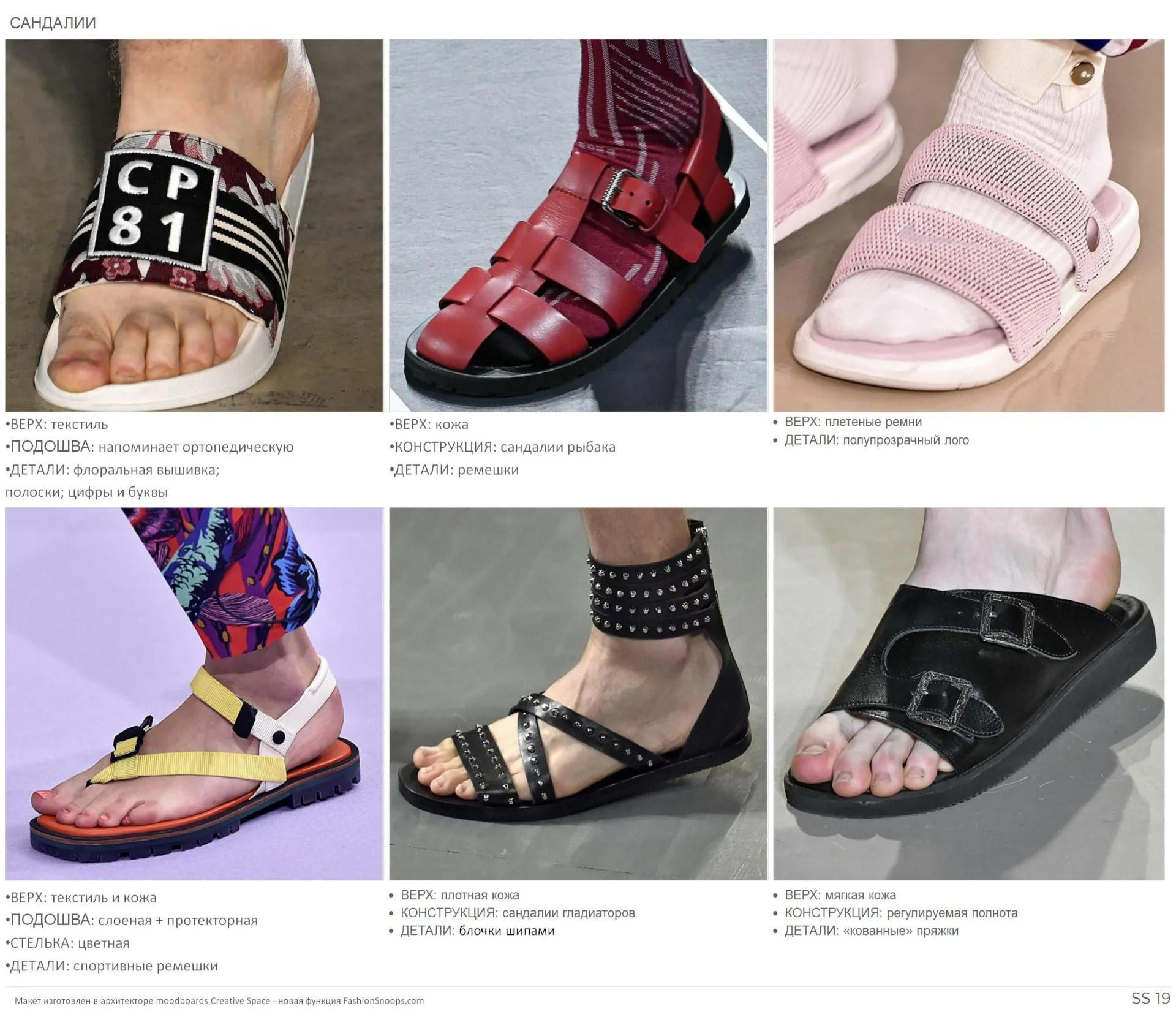 Сандалии для сезона SS19 входят как в женский, так и в мужской гардероб. Основные детали: ортопедическая стелька в сочетании с флоральной вышивкой и плетеными ремешками; блочки-шипы и мульти-ремешки; универсальная черная и бордовая кожа.
