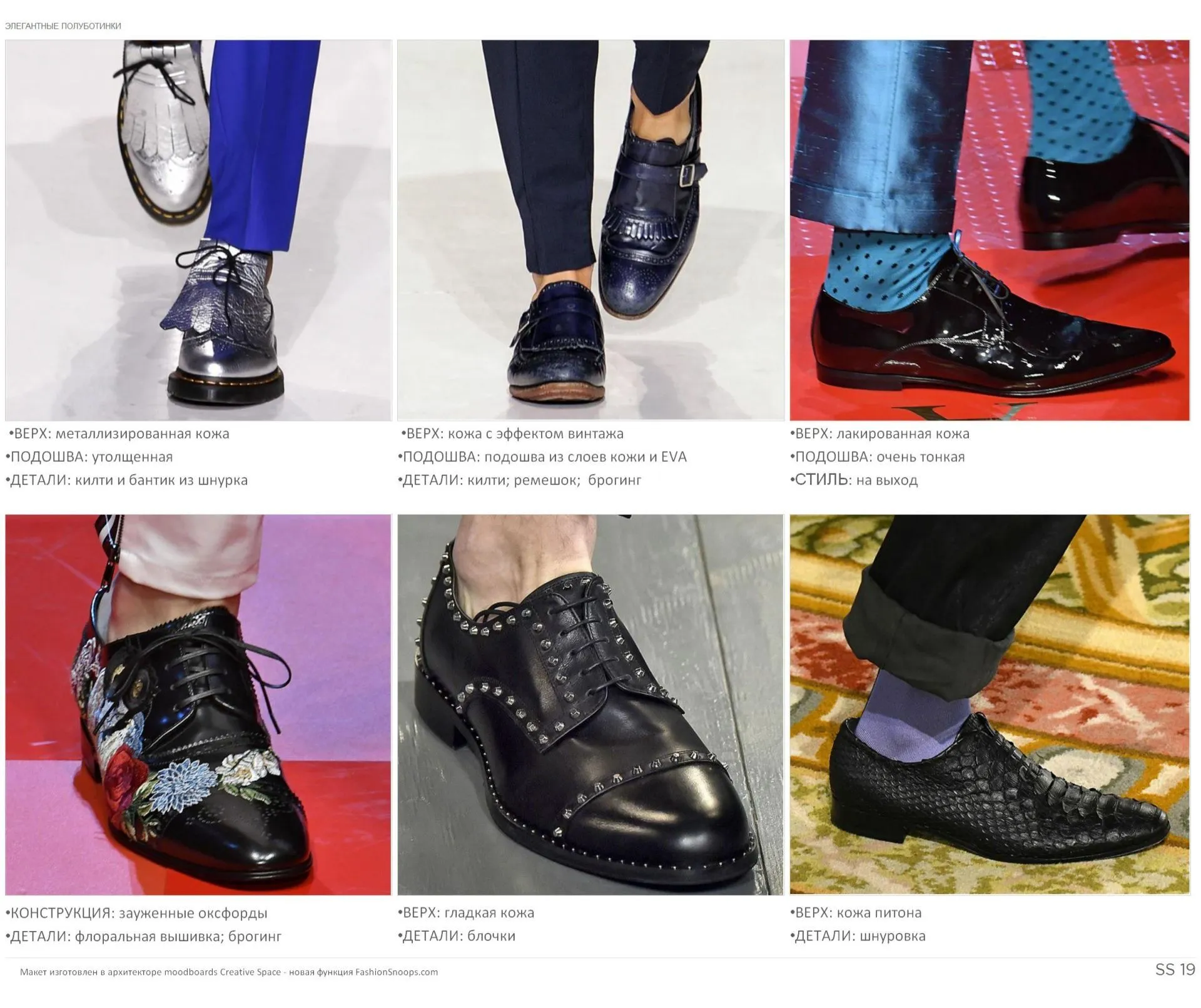 Элегантные полуботинки выполнены из лакированной, металлизированной и анималистичной кожи, а обновлены модели флоральной вышивкой с брогингом, кисточками, килти и ремешками.