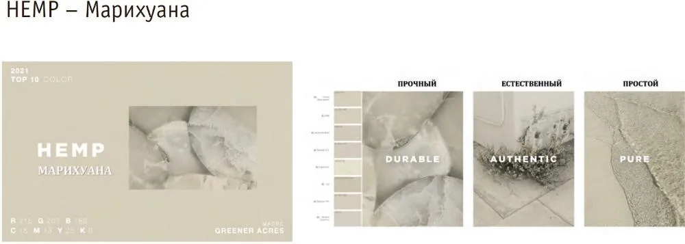 Марихуана – светлый, необычный цвет, наполненный некой жизненной энергией, но, в то же время, в нем можно увидеть отсылки к увядающей природе. Это не случайно, ведь светло- пастельно-зеленый оттенок мы можем встретить в увядающей траве, опавших листьев, старых, омытых морем камнях. В данных отголосках кроется значение цвета: он простой, естественный и, одновременно, прочный. Именно это и откликается в современных тенденциях – таких, как культурный диалог, связанный с переработкой ресурсов и экологией, органика, сельским хозяйством и даже циркулярной экономикой. Все эти темы взаимосвязаны между собой.