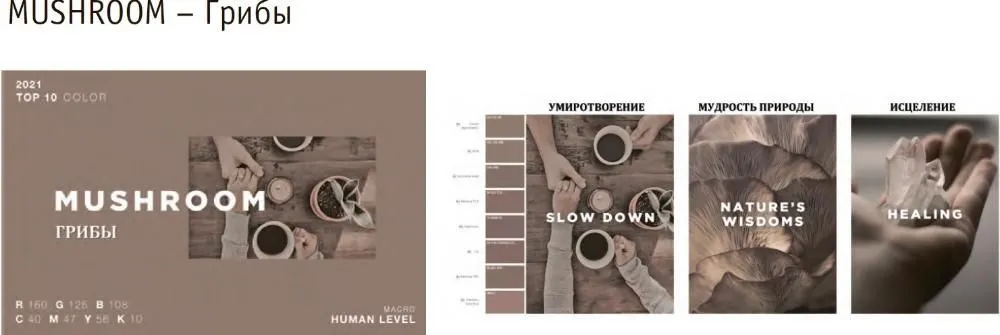 Темно-бежевый, такой нейтральный цвет по первому впечатлению, но как много он в себе таит. Его значение и смысл кроются в умиротворении, мудрости природы и исцелении. В настоящее время потребители страстно желают достичь настоящей взаимосвязи с окружающей средой, особенно когда каждый аспект их жизни контролируется техникой. Самое сильное развитие данной тематики сосредоточилось в таких трендах, как художественно-ремесленная культура, цифровое благосостояние, умиротворенная жизнь, переоценка ценностей и мастерство торговли. Искусство объединяет простые производные человека, которые природа сделала особенными и неповторимыми. Например, соляные скульптуры Сигалиты Ландау. Разве можно лучше ощутить умиротворение, чем находясь внутри спокойной и величественной природы?! Таким образом, данный цвет выступает в роли необходимого моста между природой и духовностью человека.