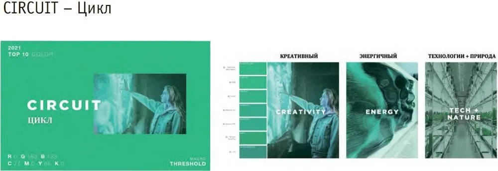 «Цикл» – это ярко-зеленый, наполненный новой энергией, вроде тот же цвет живой природы, но уже новый. Так, этот зеленый оттенок связан с искусственным интеллектом. В дивном новом мире, где люди и машины сосуществуют, «Цикл» способствует новому творческому сотрудничеству и усиливает важность свежести идей. Цвет природы, безупречно сочетающийся с технологиями, все также интенсивен. Оттенок несет стабильность и долговечность в противовес неопределенности вечно меняющегося миру. Данный цвет будет одним из центральных в 2021 году.