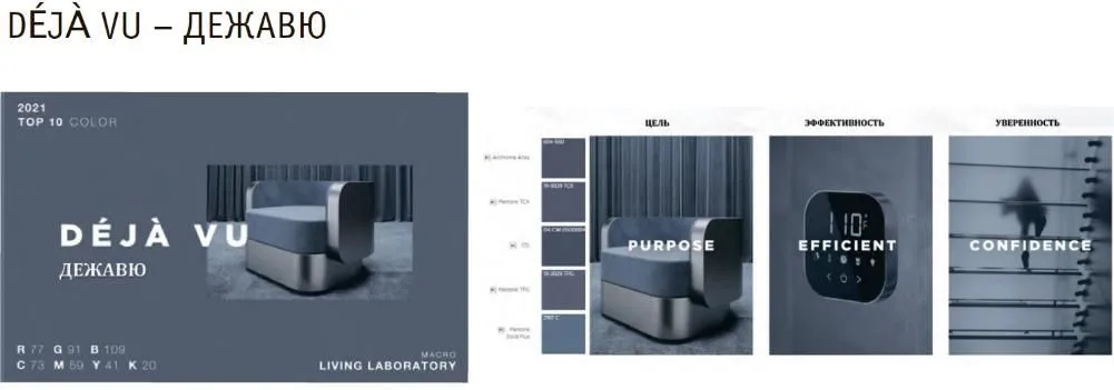 Окруженные большим объемом неопределенности, мы хотим окутать себя доверием и искренностью. Déjà Vu - надежный оттенок синего, который умудряется казаться одновременно и новым, и привычным, как хорошо знакомая картина, которая продолжает вдохновлять нас с первого момента знакомства. Он манит нас своей статной утонченностью, которая намекает на освященные веками опыт и мудрость.