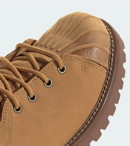 Ботинки Superstar имеют водонепроницаемый верх из нубука с язычком с клиновидной вставкой, который предотвращает попадание грязи и влаги. Замша используется на пятке и язычке, а фирменный мысок-ракушка Superstar выполнен из формованного нубука. Ребристая резиновая подошва заменяет более гладкое сцепление, характерное для Superstar. Металлическая фурнитура и шнурки разных цветов завершают обновлённый образ.