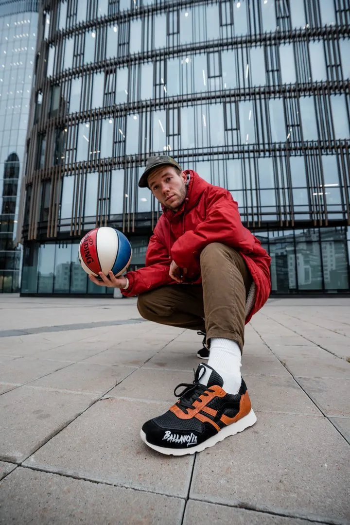 «Команда Ballaholix - это спортивная организация из Санкт-Петербурга, которая занимается развитием культуры баскетбола и хип-хопа в России и мире. Кроме того у ребят есть своя уникальная школа, в которой они обучают интересному и завораживающему искусству баскетбольному фристайлу, - говорит основатель бренда Afour Владимир Григорьев.- «Чтобы воплотить идею мы использовали, старые мячи, которые ребята ранее использовали для своих тренировок и выступлений. Мячи были аккуратно разрезаны с отделением верхнего слоя, который и послужил материалом для части деталей кроссовок. Дальше детали были особым образом раскроены, так как после разборки они сохраняли радиус мяча. Из особенностей материала, и размера лекал часть деталей мы выполнили из замши и 3D- сетки. Носовую часть обуви украшает логотип команды».