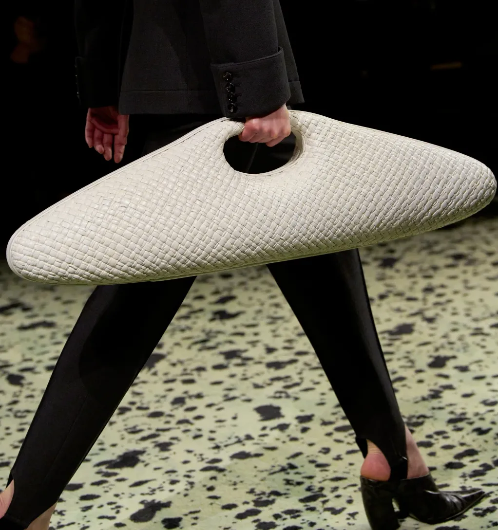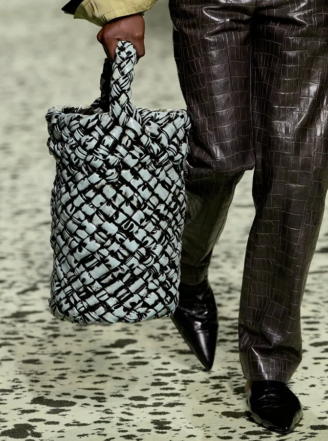 Показ люксового бренда Bottega Veneta на Неделе моды в Милане, которая завершилась 27 февраля, был изобилием силуэтов, форм и материалов, особенно в обуви и аксессуарах. Фирменное плетение из кожи intrecciato снова стало украшением изысканных силуэтов обуви, а также широко использовалось в дизайне сумок Bottega.