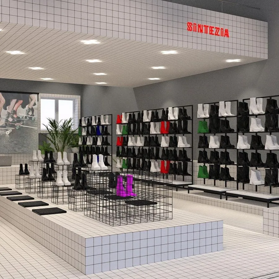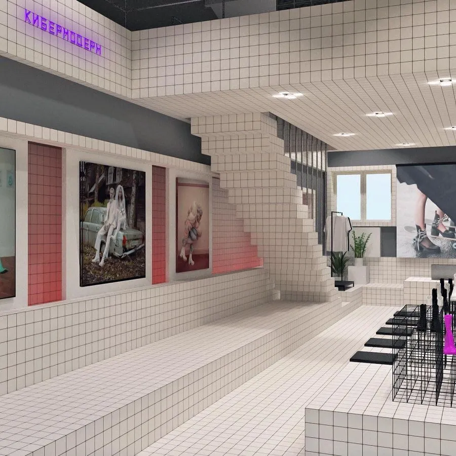 На первом этаже помещения располагается магазин, где представлены обувь, аксессуары и одежда Sintezia и галерея Кибермодерн, где планируется организовывать выставки и художественные мероприятия. Второй этаж занимает видео и фото студия бренда, который очень активно продвигается в соцсетях, в том числе за счет эпатажной, яркой рекламы, которая создается силами собственной творческой команды.