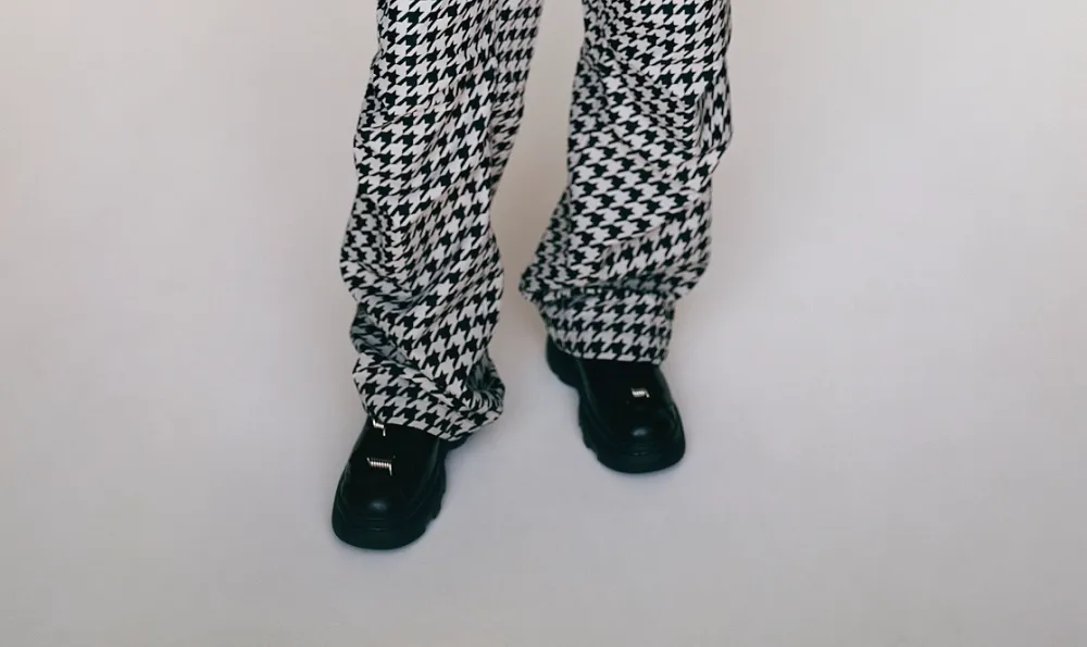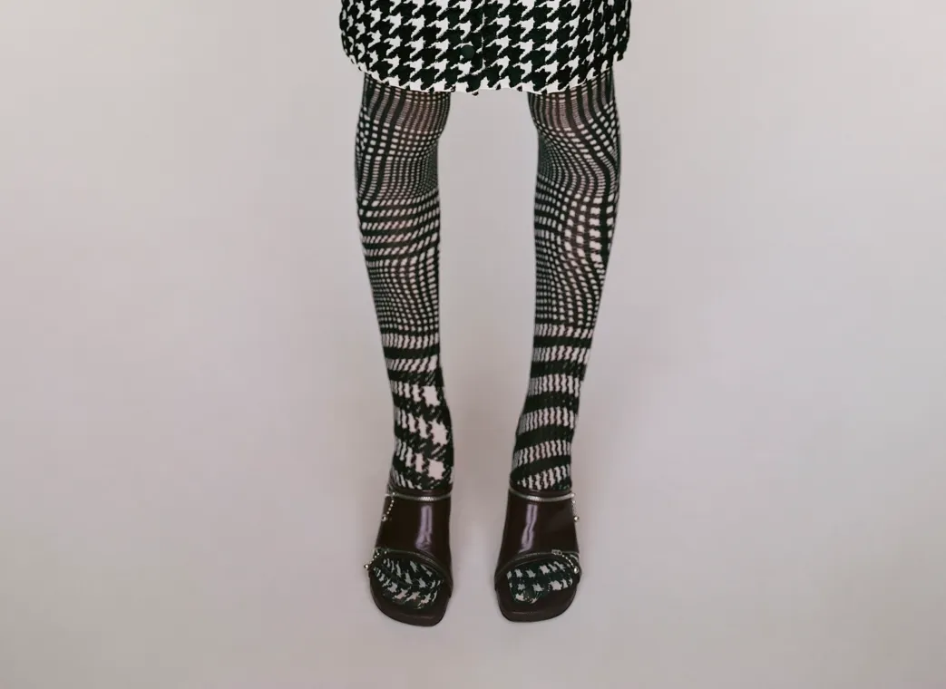 Другими элементами стали металлические пружины, обмотанные вокруг шнурков мужских черных кожаных ботинок, плетеный верх в виде веревки на паре сандалий Very-Lee. Фирменный узор «гусиные лапки» появляется в виде окантовки на молочного цвета резиновых сапогах. А черно-белая волнистая клетка и другие клетчатые интерпретации украшают дополняющие обувь колготки, а также пальто, платья, мужские костюмы и сумочки.