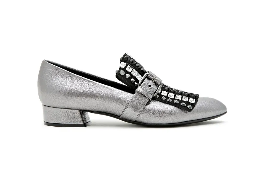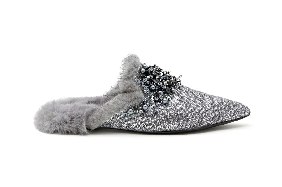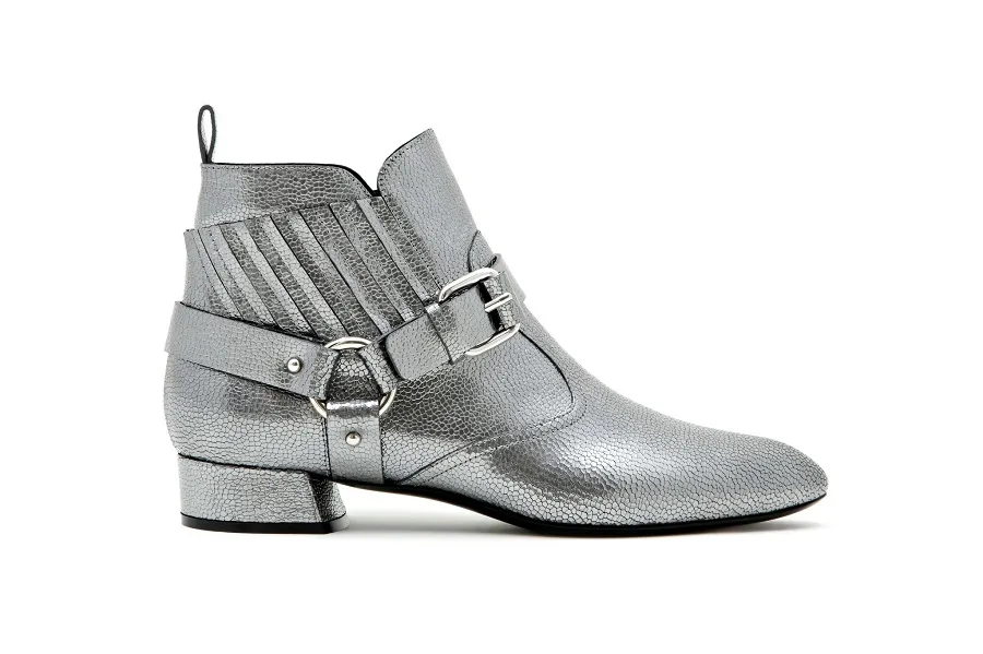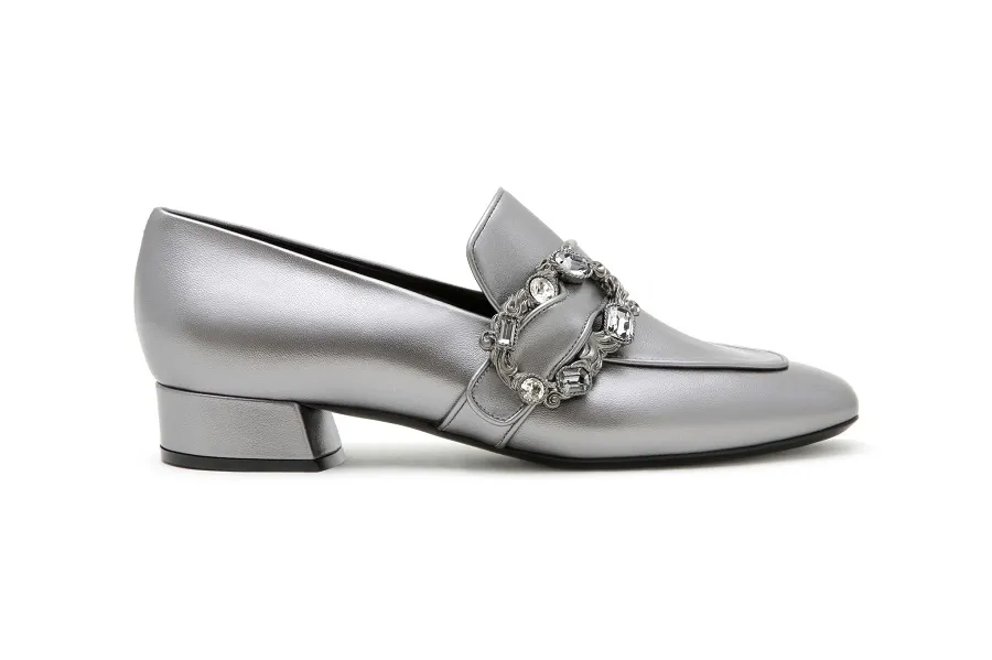 Серебристо-серый цвет металлизированной кожи стал основным в коллекции и оказался прекрасным фоном для кристаллов и камней, которыми дизайнеры бренда украсили классические туфли лодочки на высоком каблуке, лоферы, босоножки и даже бархатные тапочки. А модель ботильонов на низком каблуке из металлизированной кожи серебряного цвета выглядит нарядно и празднично за счет оригинальной текстуры верха и эффектных деталей – ремней, металлических кольца и пряжки.
