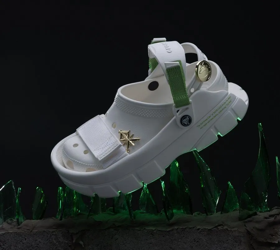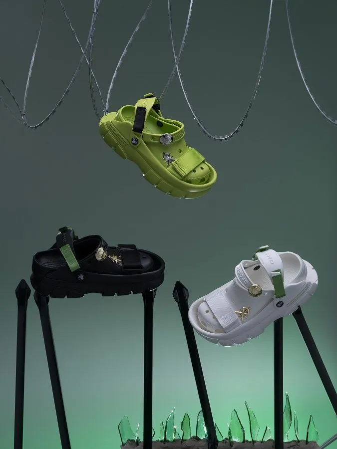 Модели выпущены в трех вариантах расцветки – черном, белом и цвете Acid Green (ядовито-зеленом), фирменном для Sankuanz. В этом цвете представлена модель Savage Forest. -Другие модели коллекции Meta Black черного цвета, классическая белая модель Eternal White. Коллаборация дополнена Jibbitz™ с символами и изображениями от SANKUANZ, Crocs и коллекции Drown 52 от SANKUANZ в ретро-футуристическом стиле, которые подчеркивают общую концепцию и тематику коллекции.