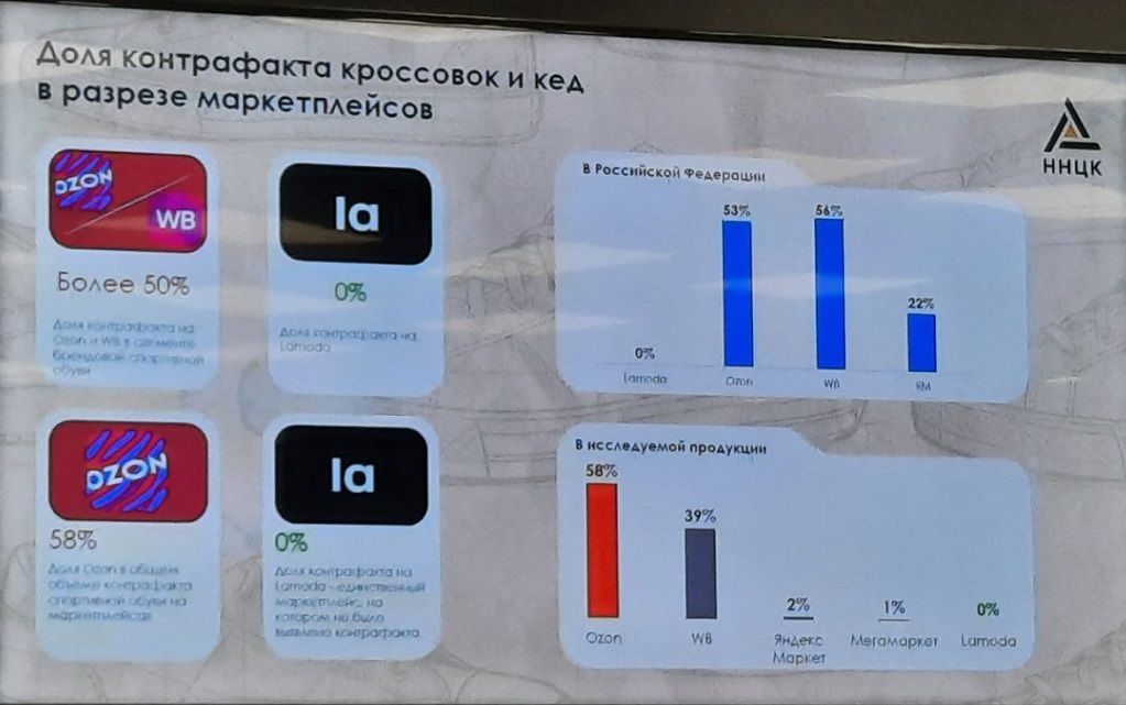По итогам проделанной работы сделан вывод, что на сегодняшний день доля контрафакта кроссовок и кед на маркетплейсах составляет 49%. Подделки присутствуют практически на всех площадках, кроме маркетплейса Lamoda, где контрафактной продукции выявлено не было.