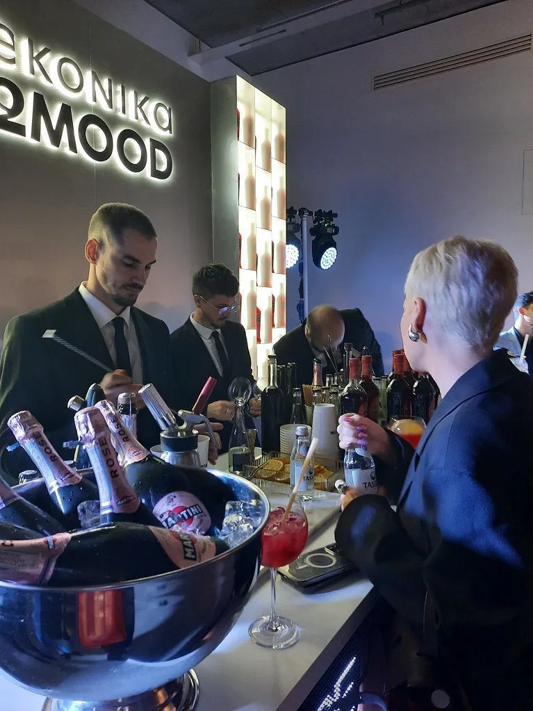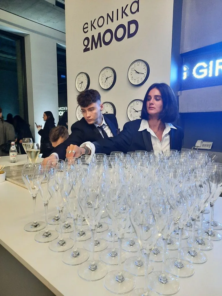 В одном из пространств презентации проходил иммерсивный показ EKONIKA 2Mood. Девушки в строгих костюмах и в туфлях лодочках, изображали офисную суету, позировали для фото и видео. За ними наблюдали гости презентации, журналисты и блогеры, гардероб которых был также выдержан в стиле back-to office. Дополнили картину два офисных бара с типичными напитками всех корпоративов на основе Prosecco.
