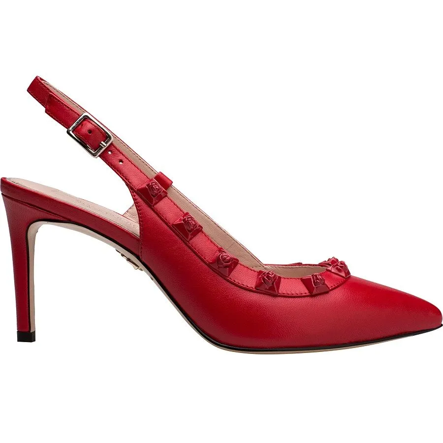 Ключевой элемент темы - алая роза из мягкого велюра, которая украшает ярко-красные лодочки, босоножки, сабо и клатч. Набор брошей в виде роз трех цветов гармонично дополняет капсулу.