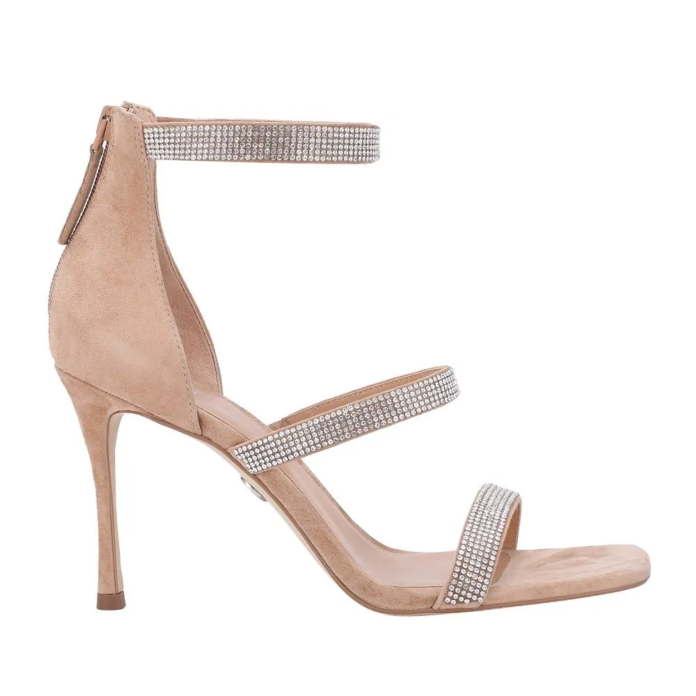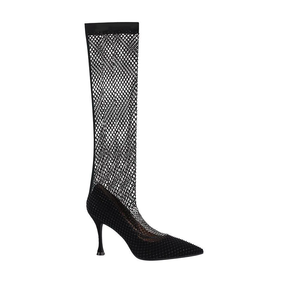 Одной из самых эффектных моделей коллекции стали туфли-ботильоны с сетчатым верхом на высоком каблуке. Для усиления настроения праздника сетка также украшена стразами. Модель выпущена в вариантах верха по щиколотке и до колена и представлена в черном и песочном цветах, в тон им подобраны два оттенка кристаллов — серебряные и черные.