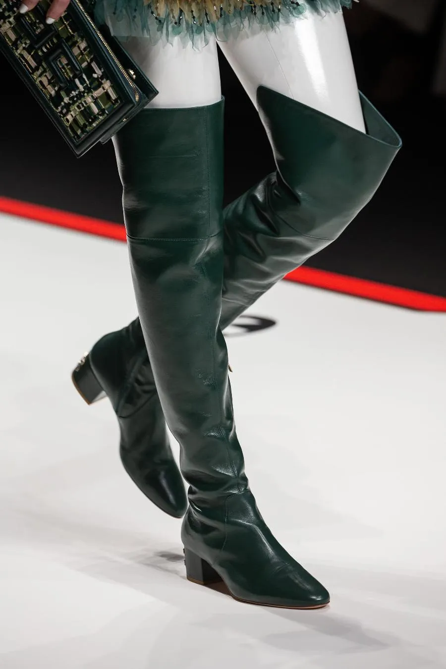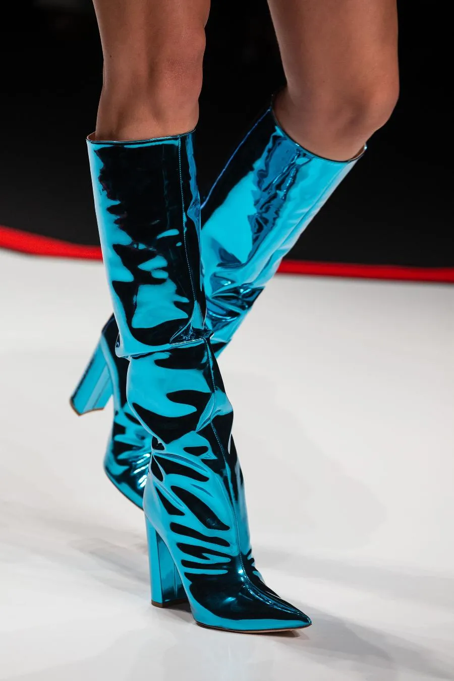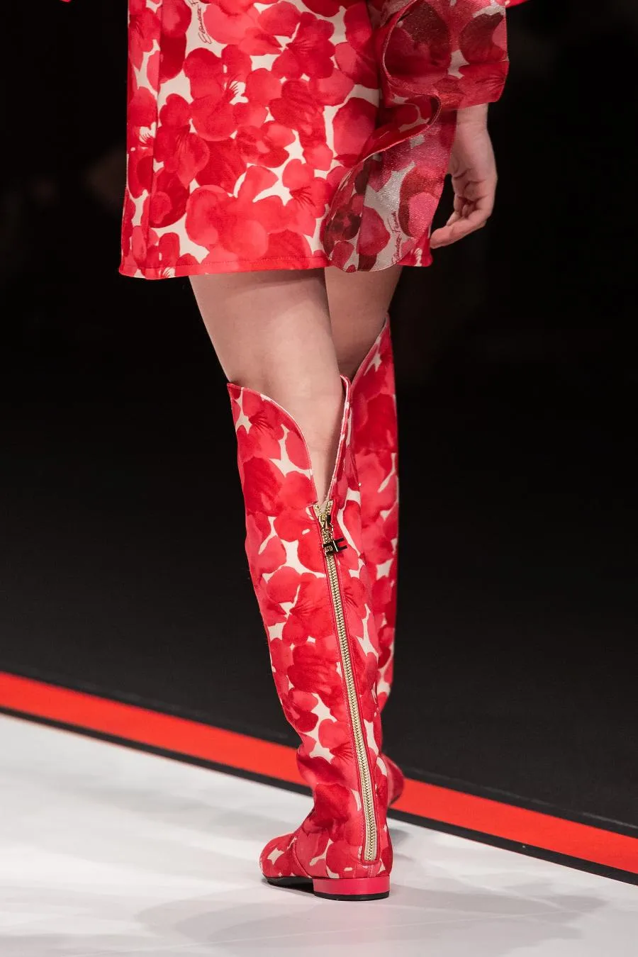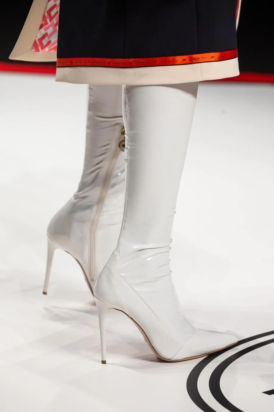 Твидовые костюмы, эффектные высокие сапоги в яркой цветовой гамме, с эффектом металлик, элегантные ботильоны и лодочки в блестящей россыпи кристаллов, - все это присутствует в новой коллекции люксового бренда Elisabetta Franchi осень-зима 2019/20.
