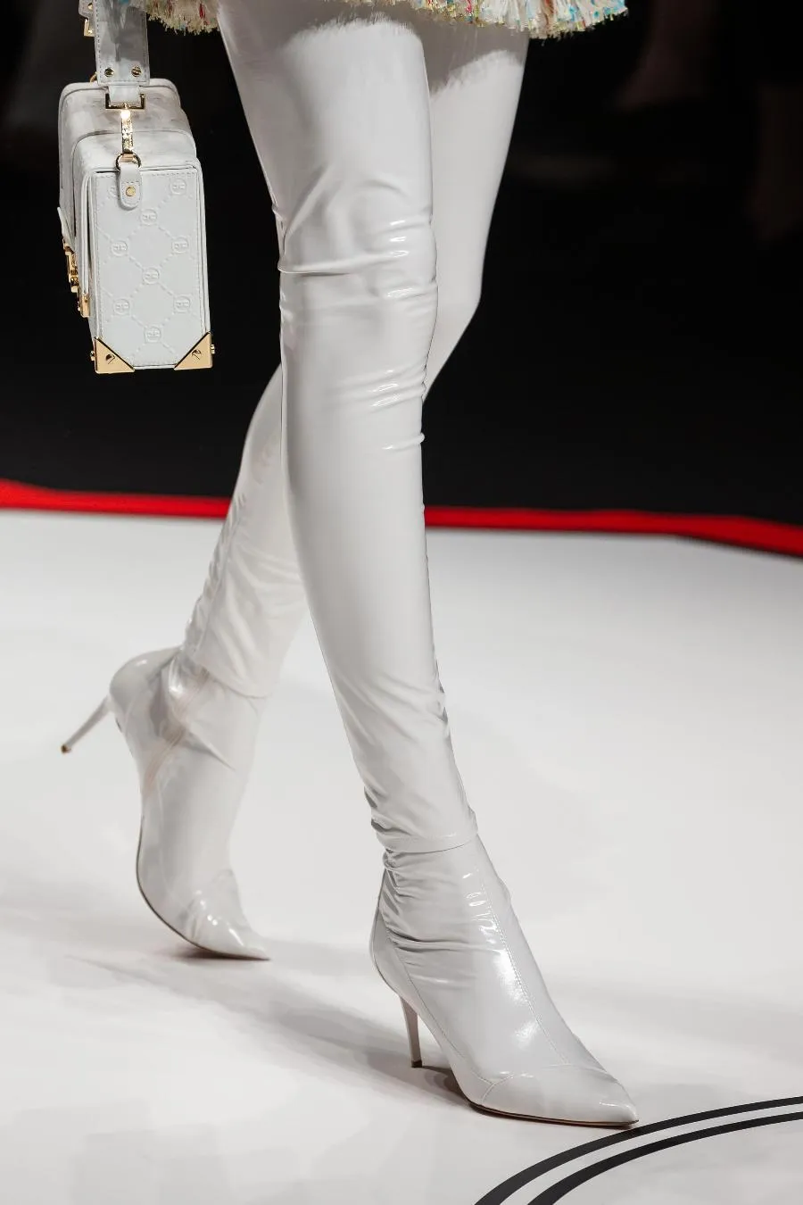 Приковывают внимание эффектные высокие сапоги, самой разнообразной расцветки и сумки разных размеров. Винил и эко-кожа стали неотъемлемой частью коллекции.