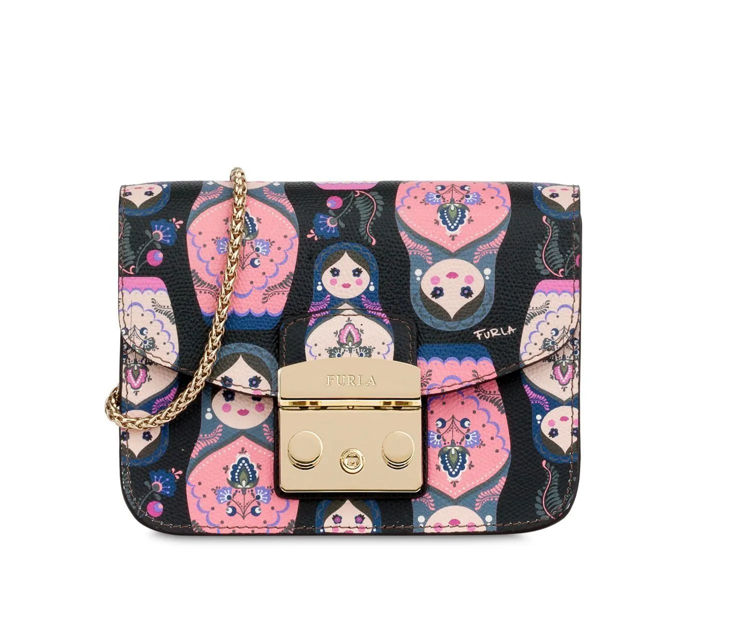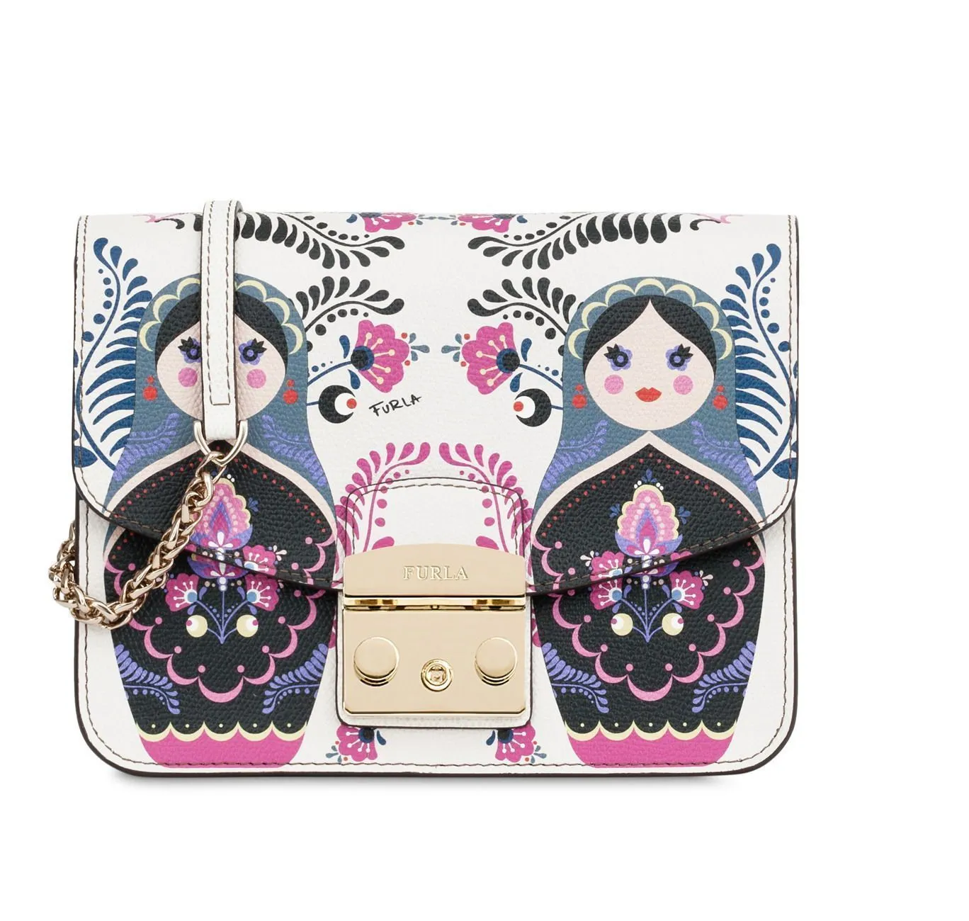 В коллекцию Furla Metropolis Matryoshka входит три модели: мини – через плечо, модель, которую носят на плече и модель с ручкой. Каждая из сумочек украшена различными рисунками в виде матрешки.