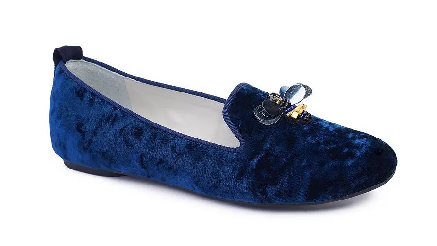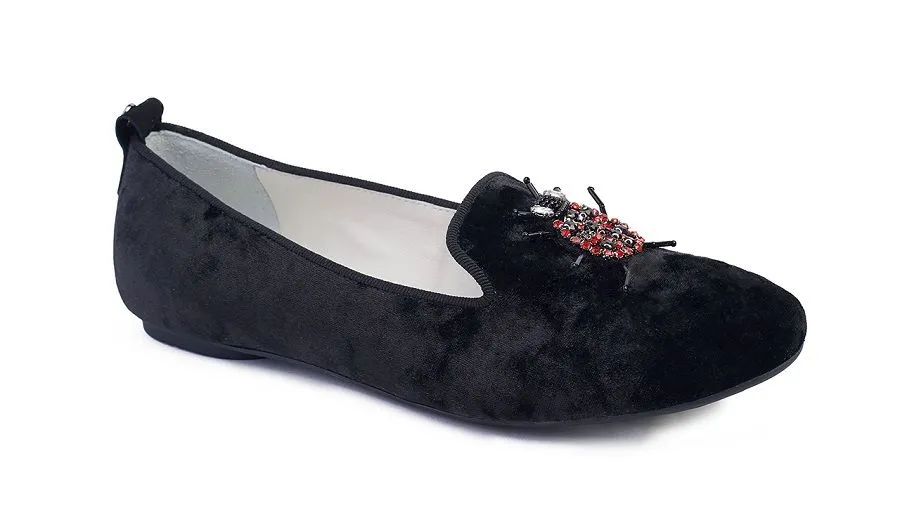 Выполненные из бархата лоферы представлены в нежно-пудровом, золотистом оттенках, в черном цвете и navy. Ряд моделей лоферов Jog Dog декорировал вышивкой из пайеток, бисера и камней в виде насекомых.