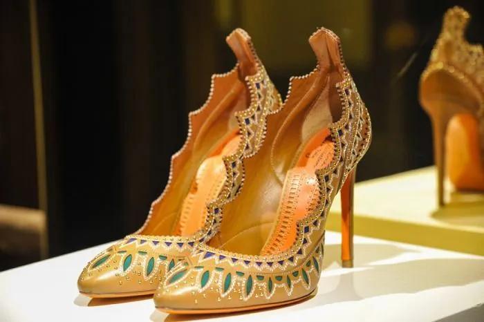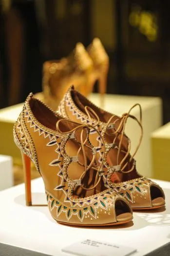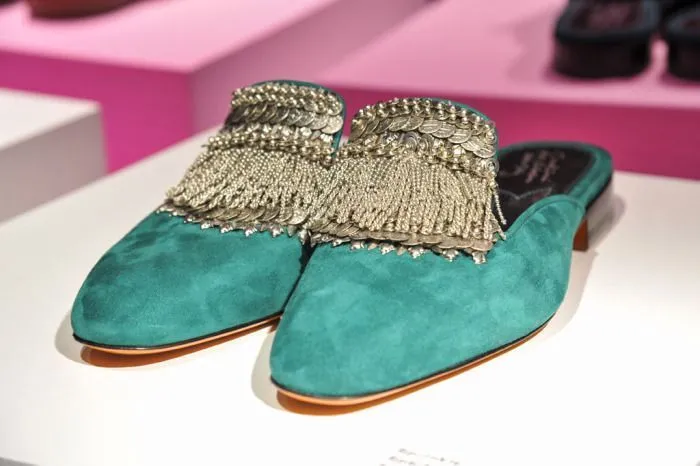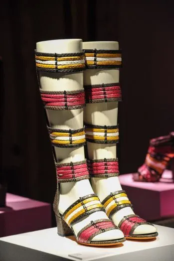 Туфли на шпильках, открытые босоножки на высоком каблуке, броги и мюли – вся обувь коллекции выполнена с использованием элементов восточных марокканских узоров, с бисером и бахромой в качестве украшений. Геометрический узор присутствует на ремешках открытых сандалий и даже на каблуке. Не обошлось в коллекции и без сандалий с ремнями, охватывающими голень по принципу сапог. Сочетание цветов и геометрия рисунка обуви Santoni - все напоминает яркий, шумный, наполненный пряными ароматами марокканский базар, и пожалуй, любую модель этой коллекции можно назвать экстравагантной.