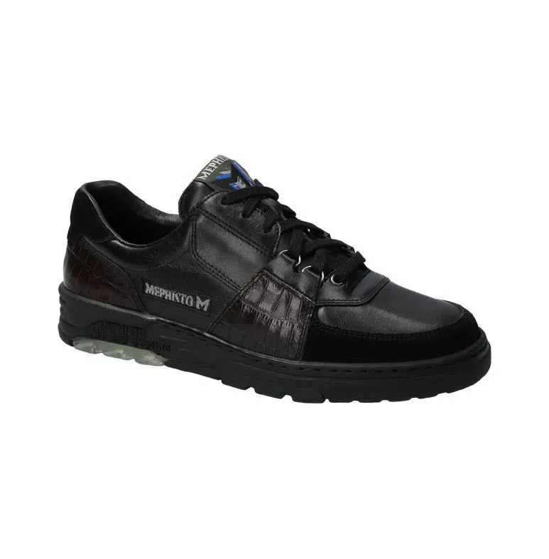 Верх низких кроссовок Marek выполнен в сочетании кожи, замши и кожи рептилии, модель представлена в черном и белом цветах. Верх обуви дополняет монохромная резиновая подошва с оригинальной вставкой из полупрозрачной резины. На боковой части подошвы присутствует надпись "MEPHISTO AIR BAG SYSTEM".