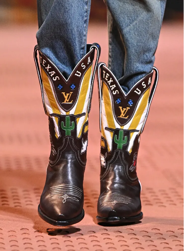 Помимо обуви коллаборации с Timberland, Уильямс включил в коллекцию LV осень’ 24 серию ковбойских сапог. Новые LV Texan, созданные совместно с опытным западным производителем обуви Goodyear в Техасе и законченные на фабрике Vuitton Rochambeau Ranch, представляют собой настоящие ковбойские казаки, украшенные стежками и аппликациями, которые сочетают в себе иконографию Louis Vuitton с иконографией американского Запада.