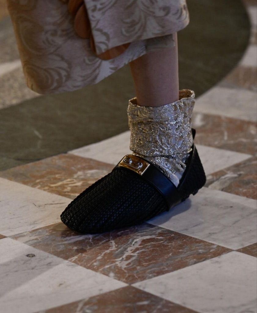 В коллекции Louis Vuitton весна-лето’26 домашние тапочки обретают новое прочтение за счет интересных цветовых решений и сочетания с носками из неожиданных шикарных материалов, как например, расшитой серебром парчи, шифона, золотистого шелка.