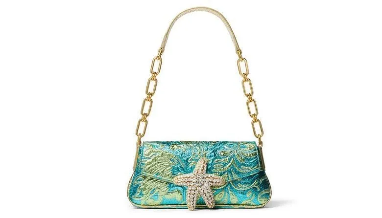 Парчовые мюли в цветах морской волны, украшенные морской звездой призваны дополнять столь же яркий летний наряд.