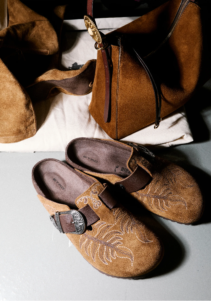 К череде коллабораций Birkenstock добавилось сотрудничество с Etro. Сабо Boston немецкого бренда украсились фирменными элементами Etro – узорами пейсли, текстурами и деталями.