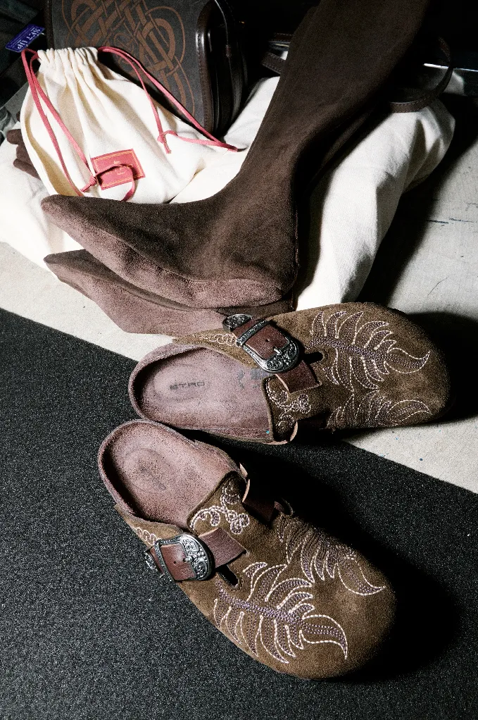 На сабо вышитые акценты и изготовленные на заказ пряжки в стиле вестерн. Подошва обуви сочетает в себе классический рисунок Birkenstock с узором пейсли Etro.
