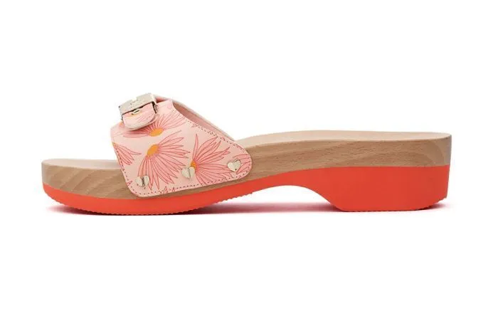 Классический силуэт сандалий-шлепанцев на деревянной подошве американского ортопедического бренда Dr.Scholl предстал в сочетании с цветочными мотивами в дизайне обуви характерными для стиля Kate Spade.