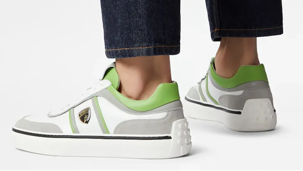 Кроссовки представлены в четырех цветовых вариантах: от простого белого до яркого сочетания серого, белого и зеленого. Вдохновленные низкими кроссовками Tod's, новые сникерсы имеют гладкий кожаный верх с замшевыми вставками, фирменные выпуклости присутствуют на пятке обуви, верх украшает логотип Lambo.