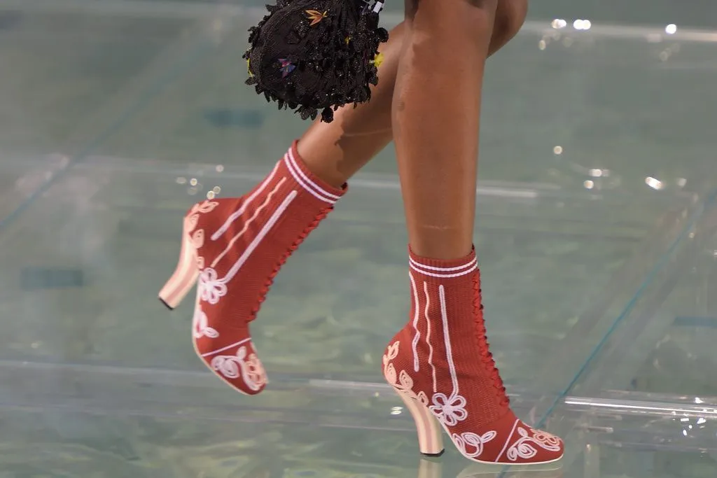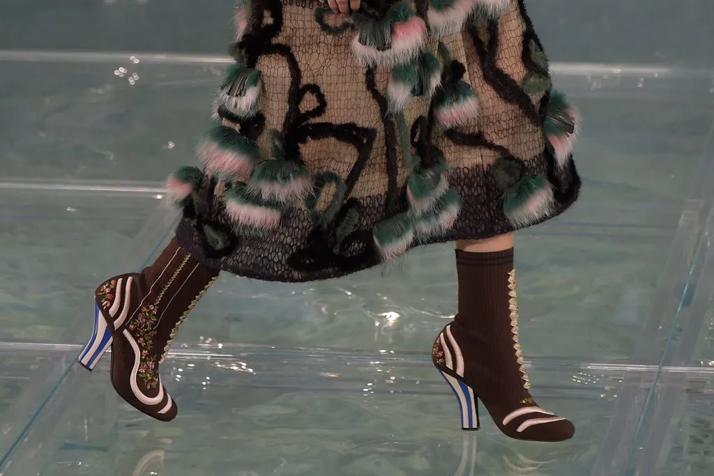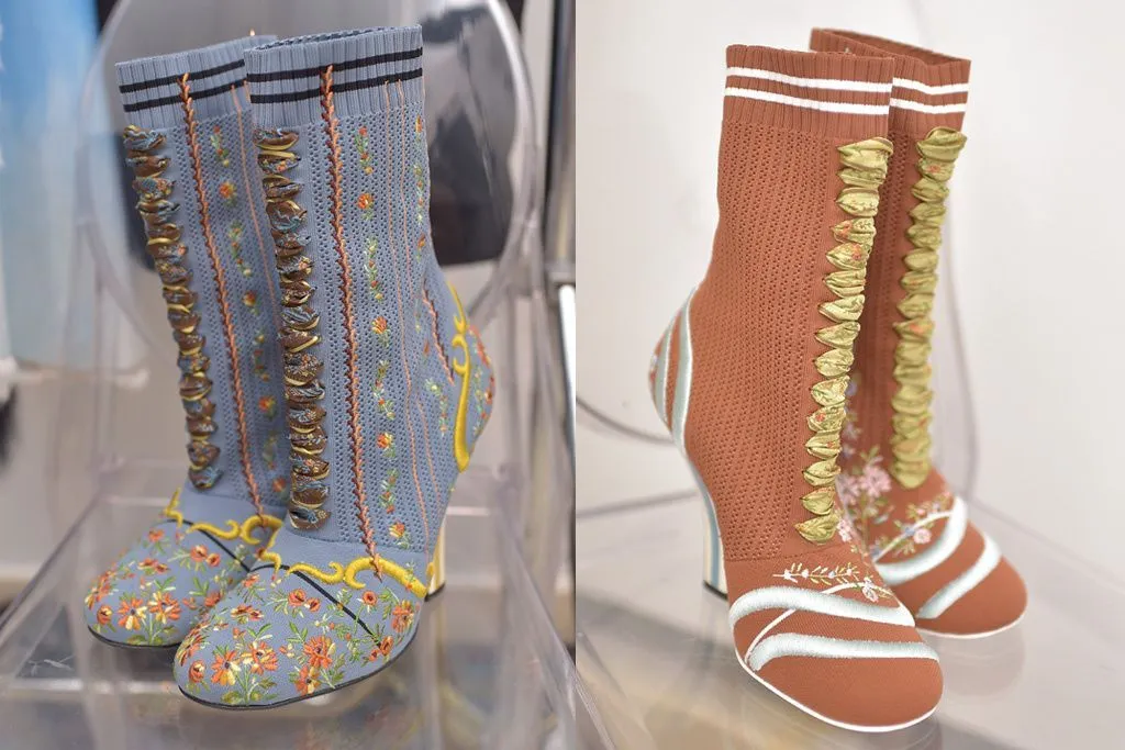 Несмотря на то, что главный акцент в новой коллекции люксового бренда был сделан на изделиях из меха, обувь, представленная во время показа, также заслуживает внимания. Обтягивающие лодыжку ботинки, на шуровке, со слегка изогнутыми каблуками, украшенные вышитыми вручную цветами, напомнили об изысканной и женственной моде начала 20 века.