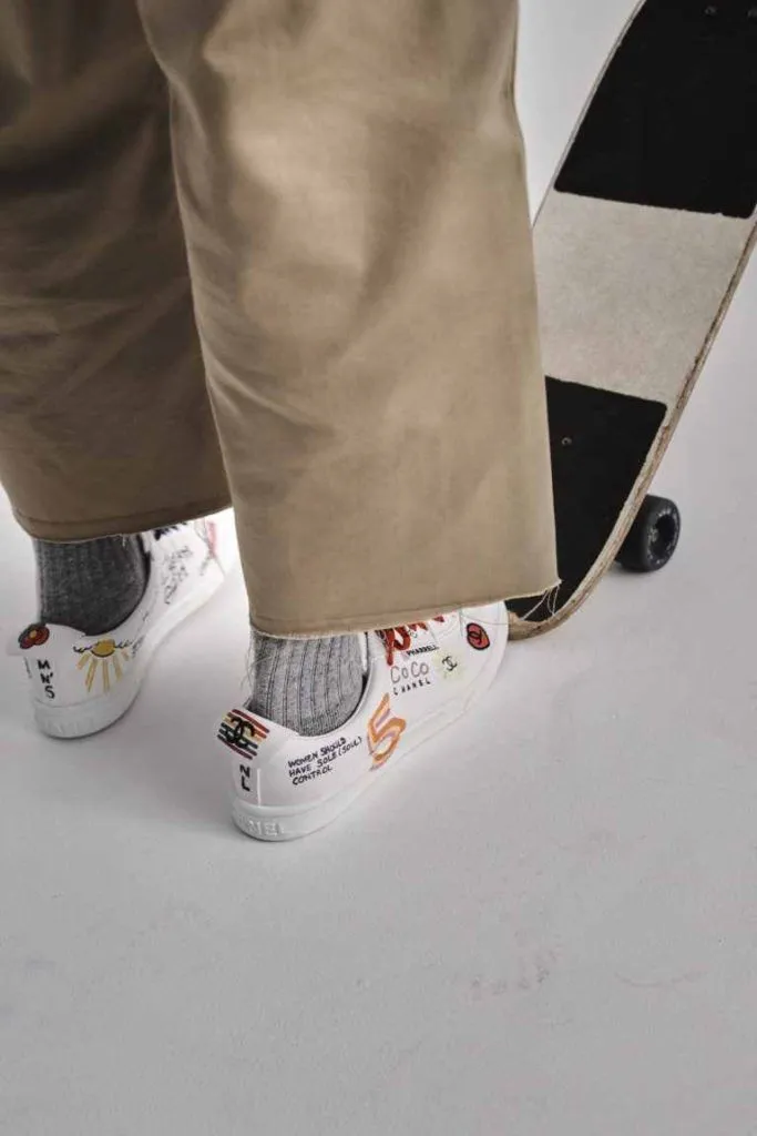 На его ногах белого цвета кроссовки с надписями и рисунками от руки, логотипом Pharell Chanel и шнурками разного цвета, в руке тканевая зеленая пляжная сумка Kelly также испещренная логотипами обоих брендов, на носу зеленые круглые солнцезащитные очки с контрастной белой надписью - Pharell Chanel, логотипом коллаборации.