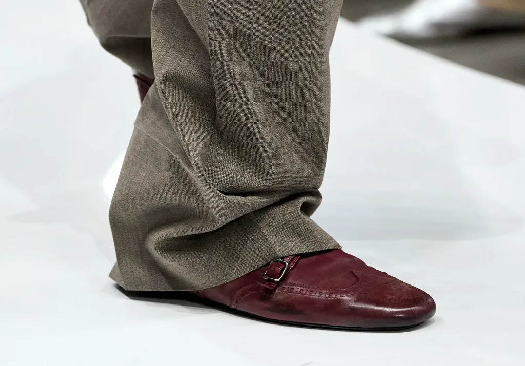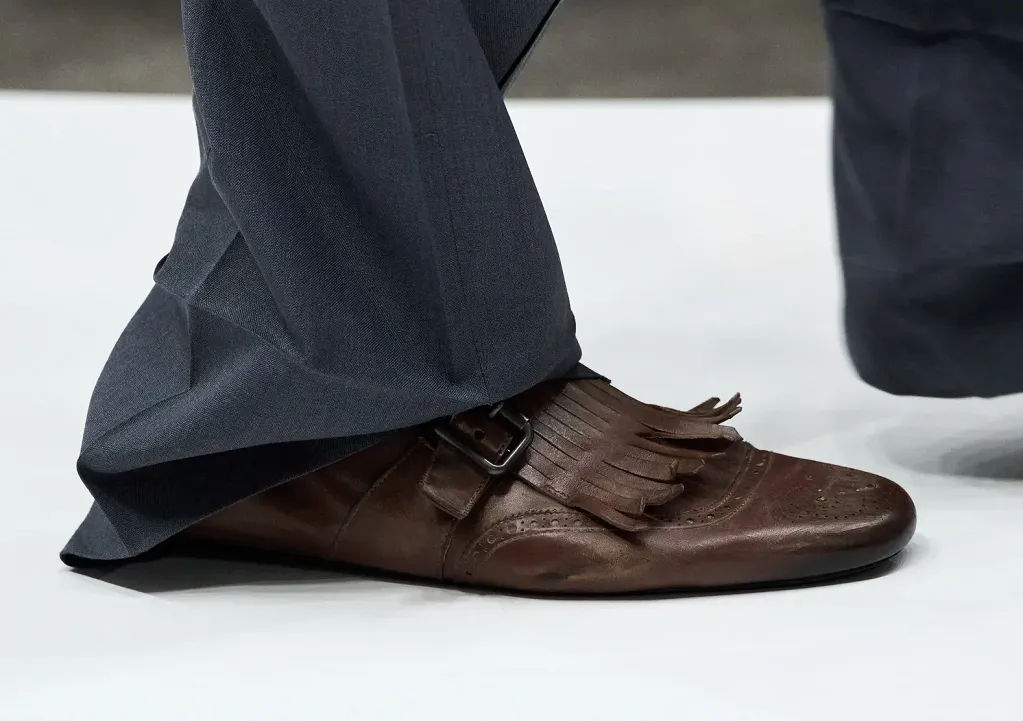 В коллекции Prada появилась интерпретация ботинок монков, которые визуально выглядят так, как будто у них вообще нет подошвы, а также гибридный вариант мужских классических туфель и шлепанцев - с перфорированным рисунком верха, с бахромой из кожи, но без задника и на плоском ходу.