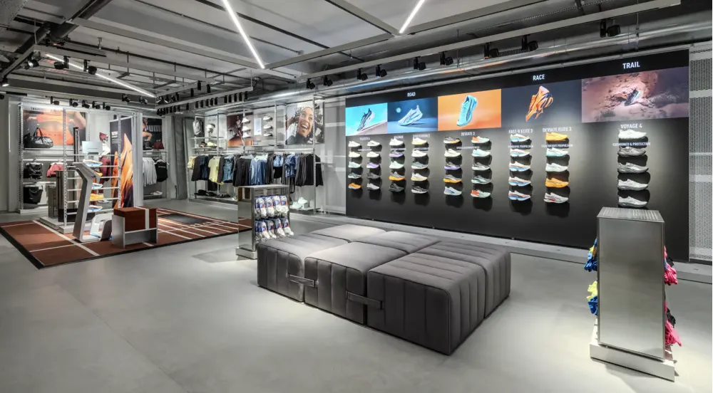 Отличительные элементы в дизайне розницы - видеостена с беговой экипировкой, реагирующая на малейшее прикосновение, и архивное пространство, где представлены культовые модели, охватывающие 77 лет истории бренда.