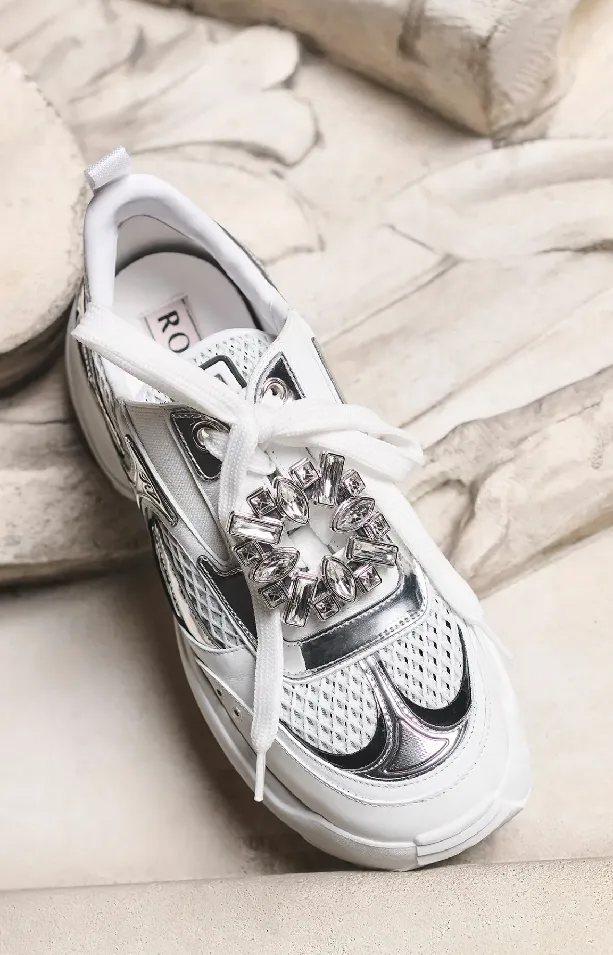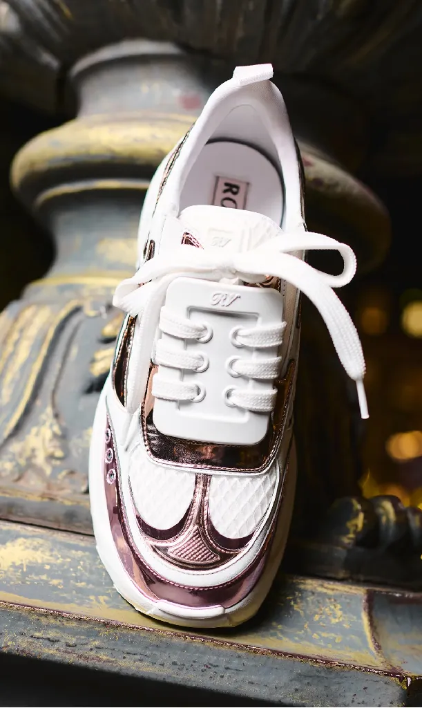 Кроссовки Viv’ on the Run от Roger Vivier доступны в четырех цветовых вариантах, включая белый с серебристой или розово-золотой кожей, черный с белыми акцентами и телесный с розово-золотым блеском.