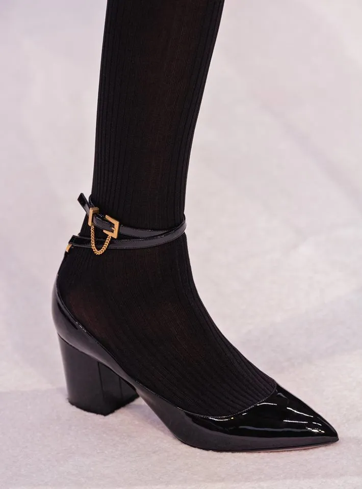 Возможно кто-то, взглянув на коллекцию обуви Valentino осень-зима 2019/20, назовет ее немного скучной. Ведь в ней нет ни перьев, ни стразов, ни ярких цветовых сочетаний. На последнем показе бренда только две пары красных ботинок выделялись в море обуви черного цвета.