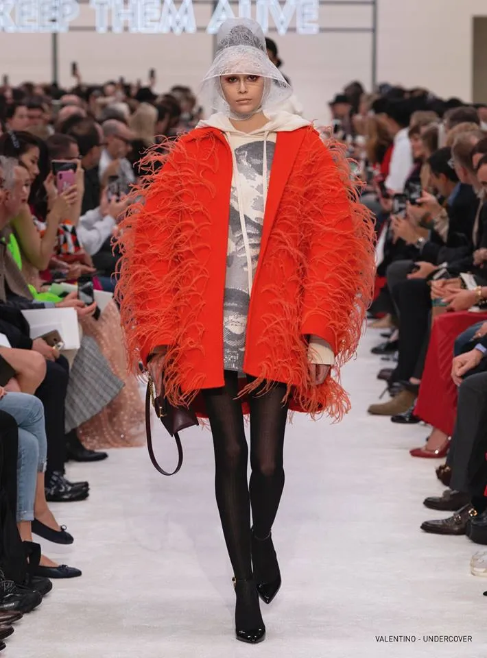 Элегантный черный создавал отличный контраст достаточно разнообразной по цвету коллекции одежды Valentino, где украшенные броскими принтами и страусовыми перьями пальто то тут то там дополнялись несколько футуристичными женскими шляпками в форме купола.