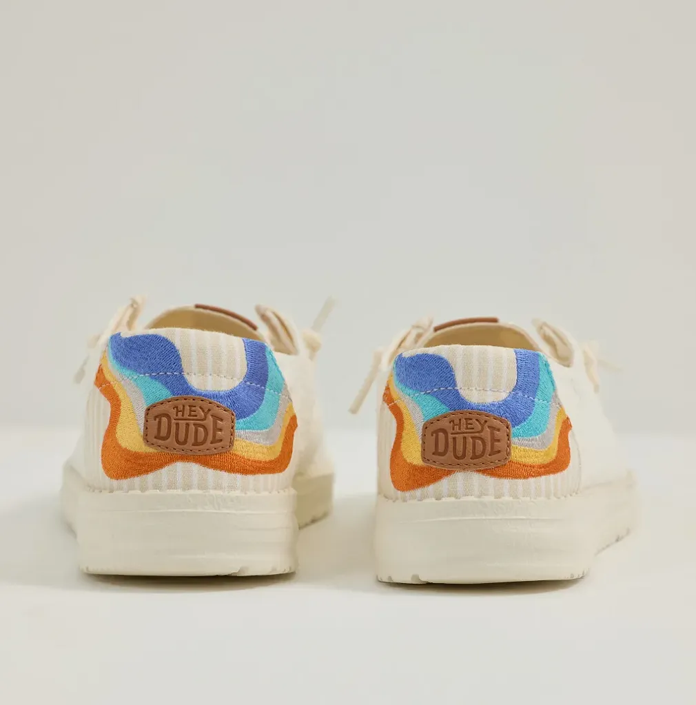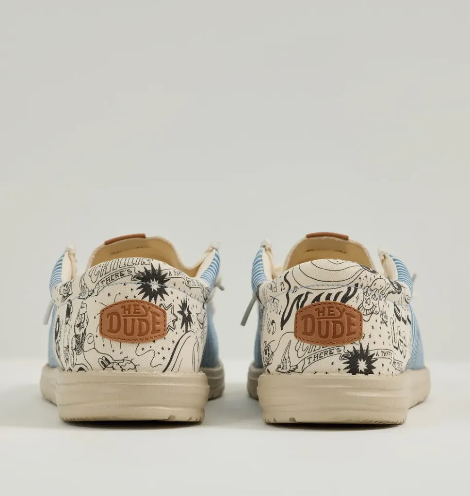 Ключевым элементом дизайна, как в обуви, так и в одежде стали принты в виде графических рисунков, напоминающих коммиксы. Они также присутствуют на подкладке обуви и хорошо гармонируют с крупными логотипами Hey Dude и Lee в ярко-желтом цвете.